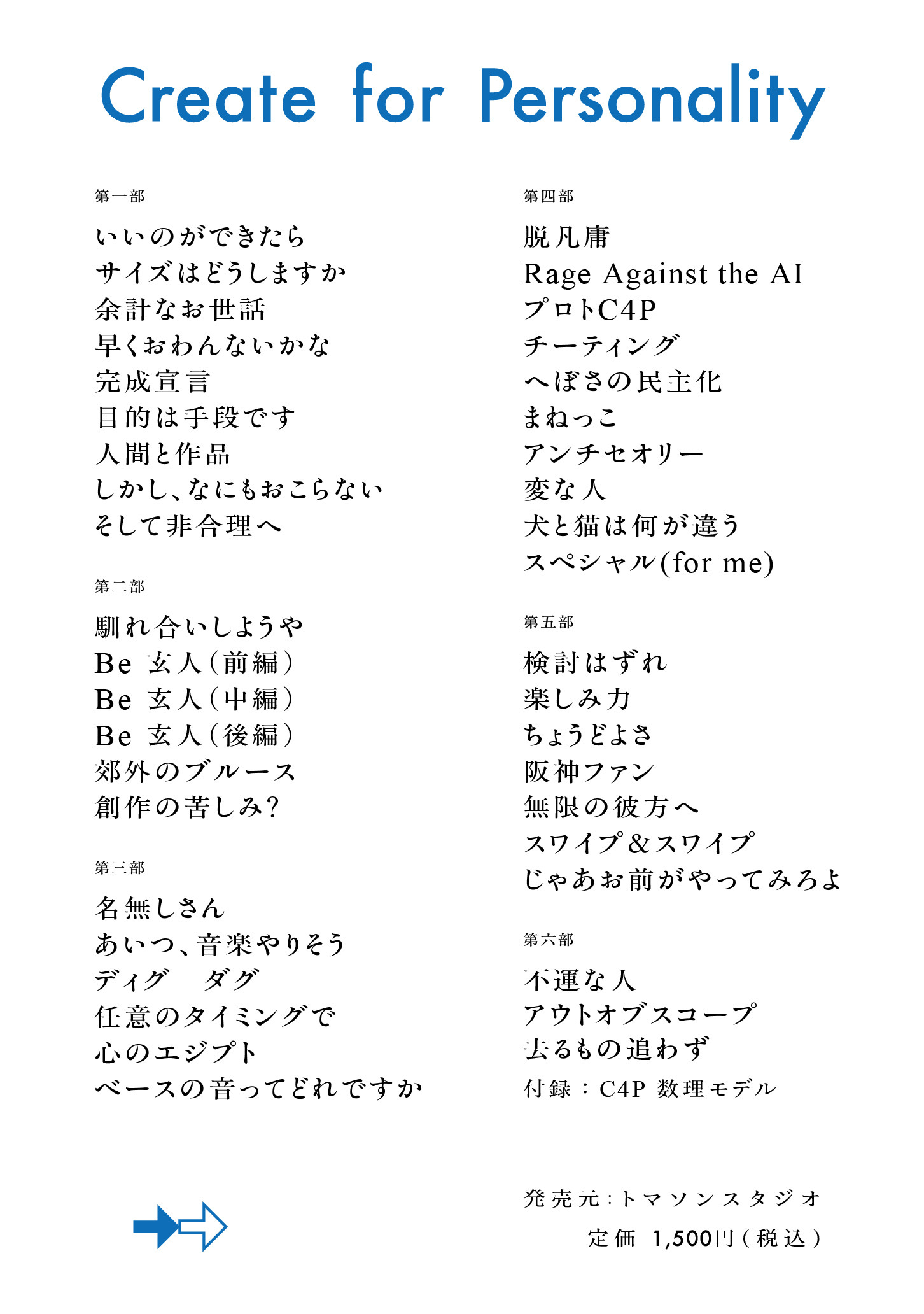 in the blue shirt初のエッセイ集、書籍版「クリエイト・フォー・パーソナリティ」の予約を開始しました。リアル販売は5/4の文フリ東京からです。デザインは吉川和弥が担当です。まあsubstackでの内容と大体同じなので、このメルマガ読者的にはお布施ポジションの商品となっています。
